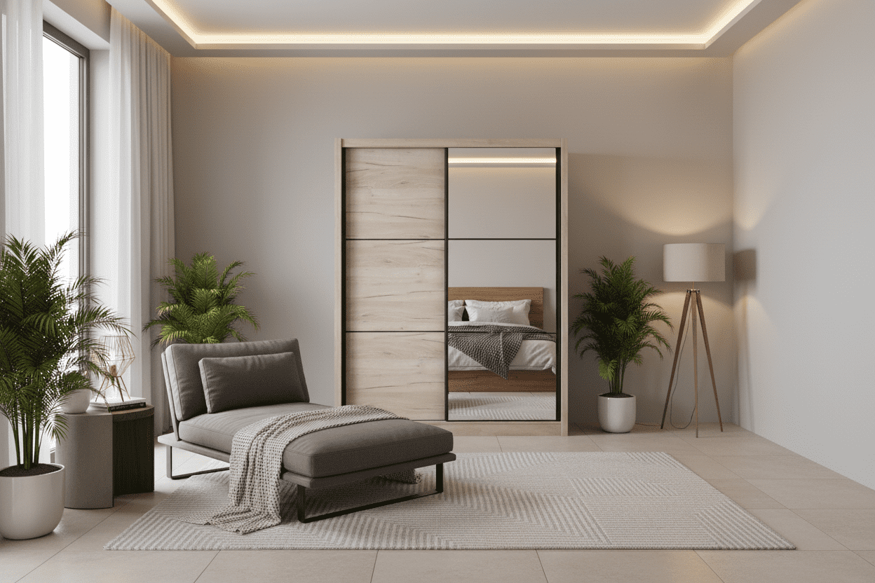 The mirrored door not only adds a contemporary design feature but also eliminates the need for a separate mirror—making it a practical and stylish choice for any bedroom layout.