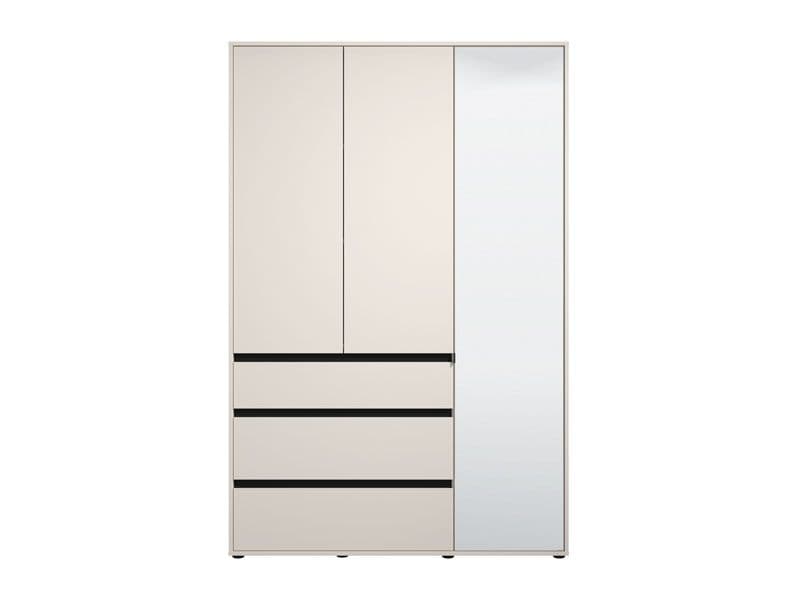 The Corbett Cashmere 3 Door 3 Drawer Mirrored Wardrobe is a bold and functional storage solution designed for modern UK bedrooms. Finished in a rich matte cashmere tone with sleek black matte foil accents, this contemporary wardrobe delivers both warmth and striking contrast.