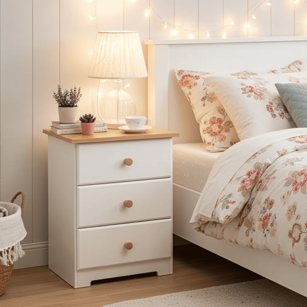 An excellent combination of white MDF and oak will give your bedroom a fresh, modern look. This bedside table comes with 3 drawers for storage. The top is expertly crafted with oak veneer for great build quality. This is the regular version of this bedside cabinet, there is also a petite version with 2 drawers available.
