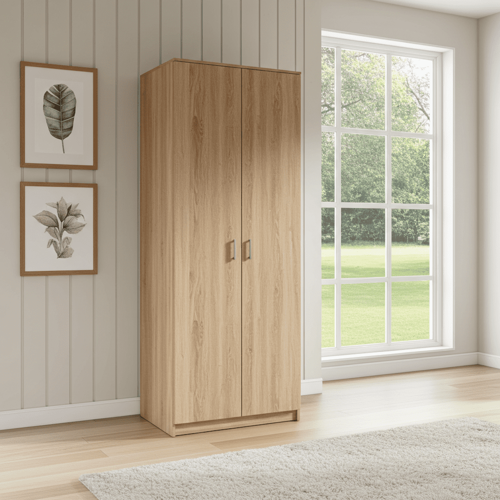 Elegant double wardrobe from the Hana range in sonoma oak effect. This modern 2 door wardrobe bedroom wardrobe comprises of hanging rail and shelf. It will contribute to the functional organisation of your room.