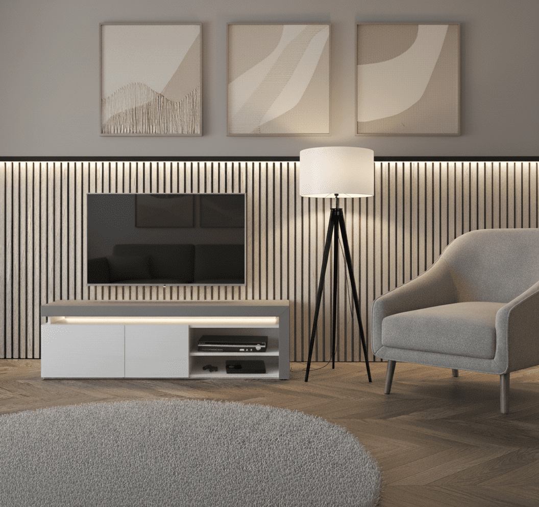 Lathea is a top-quality and elegant TV cabinet in white gloss and grey with LED lights that sits under £300! Designed to perfection, the Lathea modern TV entertainment unit consists of 2 cupboards and an open shelf with lights, making this furniture piece look stunning in any modern decor. This television stand is designed so that your TV sits at a perfect height for the most desirable viewing experience. Lathea TV unit will hold televisions up 65" in size. Other matching furniture also in stock - search 'Lathea' to view the full range!