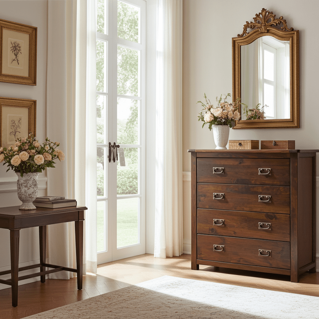 This Lincoln 4 drawer chest is handcrafted with precision and comes as a part of our premium collection. The chest comes beautifully stained and polished in an elegant dark lacquer which will bring a touch of the old fashioned colonial days. The 4 drawer chest is very sturdy and is made with oriental softwood with ash veneer panels.The handles on this chest are made from antique brass.