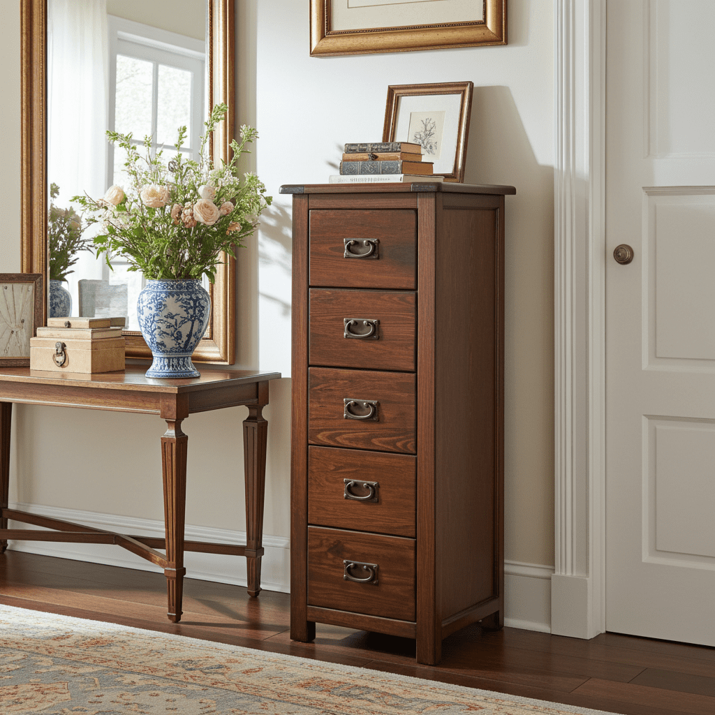 This narrow Lincoln 5 drawer chest is handcrafted by experts and is part of our premium range of home furniture. It comes in an old fashioned style that brings about a touch of the colonial days in your home with its polished dark lacquer finish. The chest is very sturdy and is made with oriental softwood with ash veneer panels.The handles on this chest are made from antique brass.