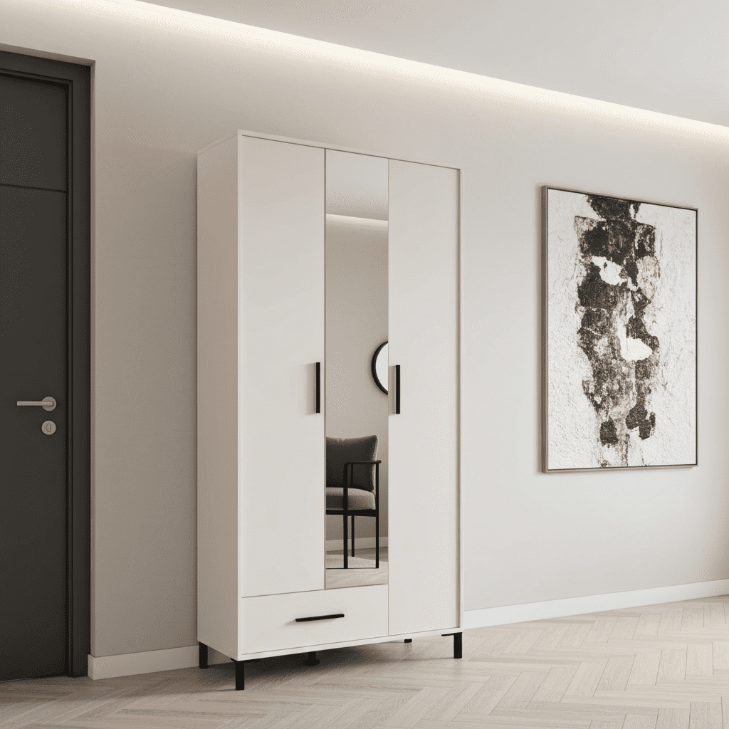 Orkney White Shallow Depth Wardrobe for Small Spaces with 3 Doors, 1 Drawer, 1 Pull-Out Hanging Rail, and 6 Internal Shelves – Modern Style and Functional Design!