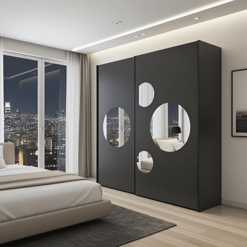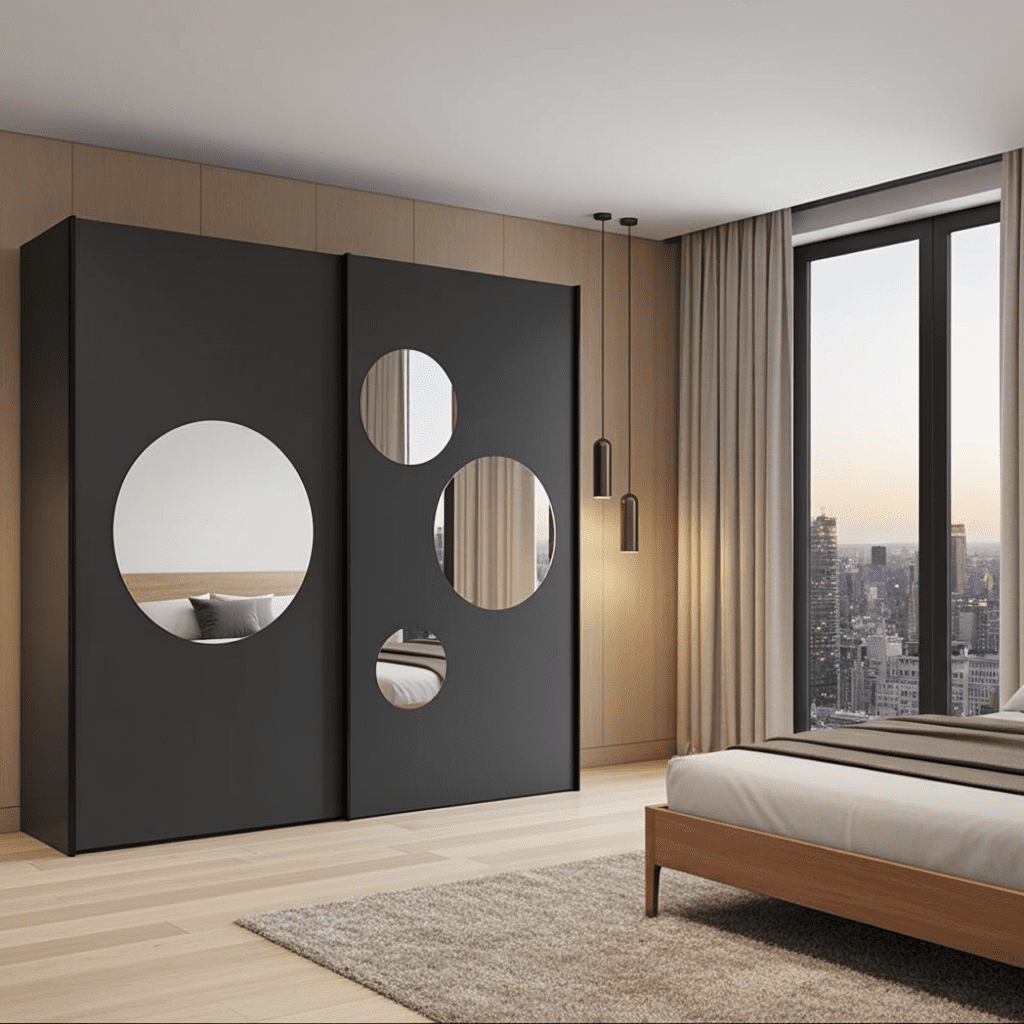 - 2 sliding doors with 4 round mirrors for a sleek and artistic touch