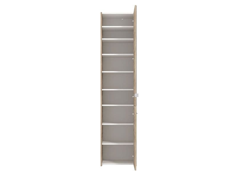 The Tokyo Shoe Cabinet is a sleek and practical solution for organising your footwear. Designed to save space, its tall and slim profile fits seamlessly into compact areas, while the elegant oak effect finish adds a modern and sophisticated touch to your home. The mirrored front not only enhances light and creates the illusion of a larger space but also serves as a handy feature for checking your look. Inside, eight spacious shelves provide ample storage, accommodating up to 30 pairs of shoes for a neat and clutter-free home.