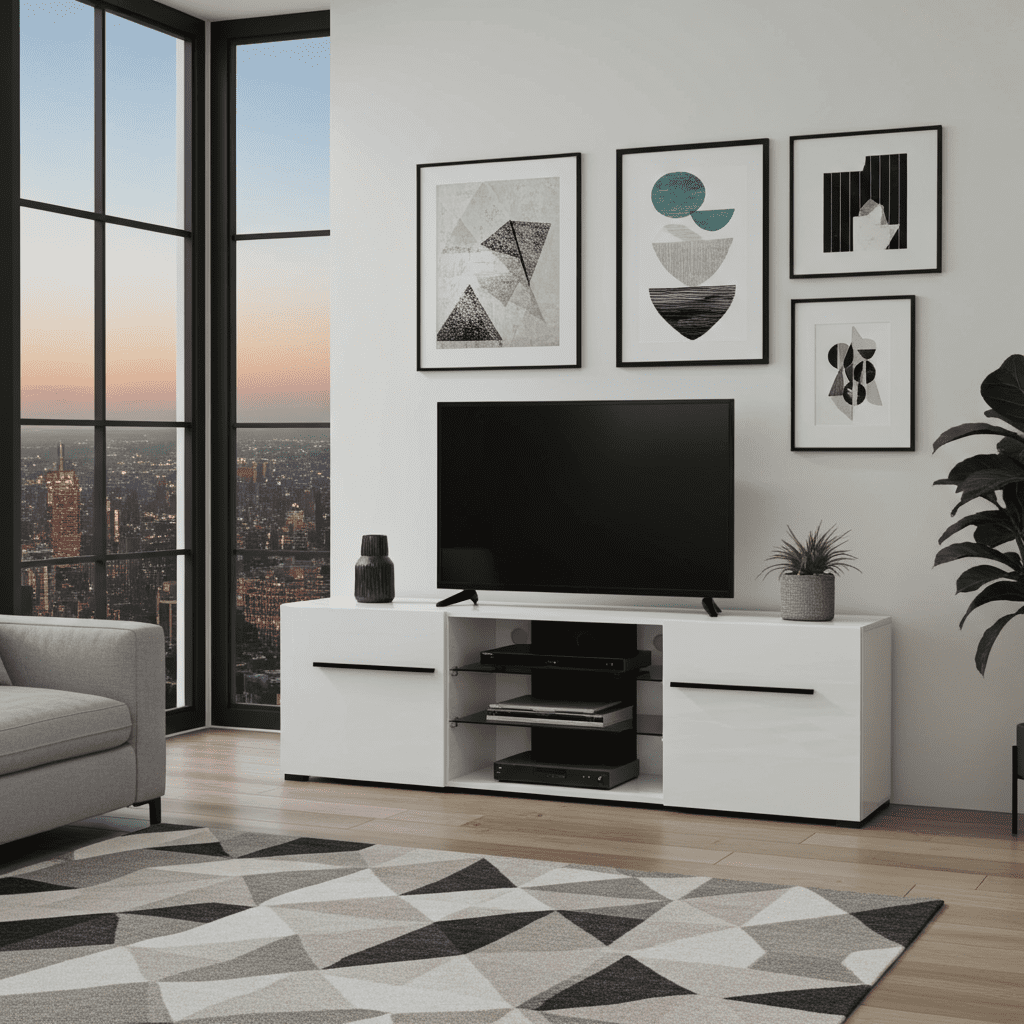 - Finish: White Gloss with Tinted Glass Shelves